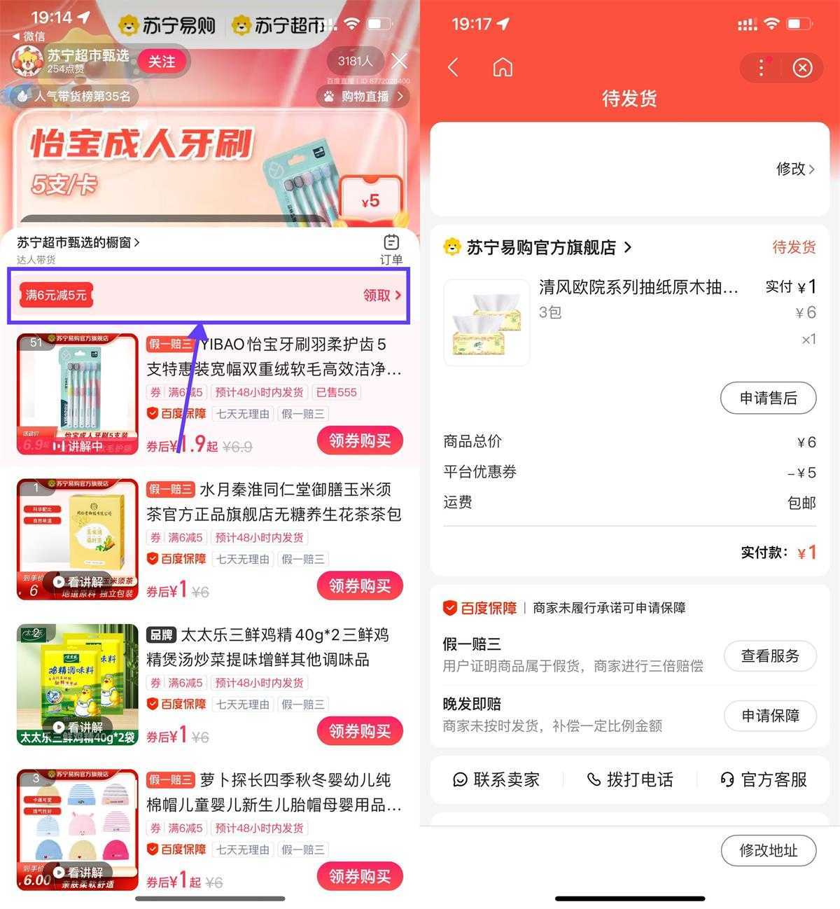 打开地址跳转到百度APP->关注领6减5元券->购物袋里有1亓4瓶可乐