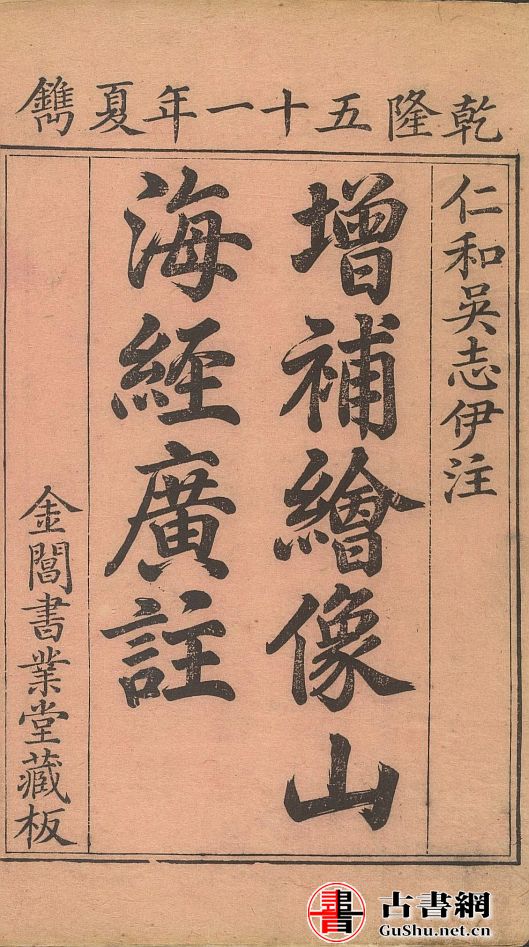 此为清乾隆五十一年,有金阊书业堂刻本,吴任臣注的《山海经广注》,增补《山海经图》五卷,有图一百四十四幅,称为《增补绘像山海经广注》。吴任臣,清代学者兼藏书家,仁和人(今浙江杭州),康熙十八年(1679年)举博学鸿词科,授检讨。吴任臣为人好精乐律和奇壬之书,为顾炎武所推重。吴任臣的《山海经广注》,引书目530余条,于名物训诂、山川道里,皆有所订正,在《山海经杂述》中列逸文三十四条,这是郭璞注《山海经》后,现知的第一次认真的《山海经》辑佚工作,对后人的研究探讨,都有着重要的启示。吴仁臣的《增补绘像山海经广注》中的图本,按神、兽、鸟、虫、异域分类,一神一图,无背景,线条粗糙,但注重眼睛的描绘,给人以粗中有细的感受。