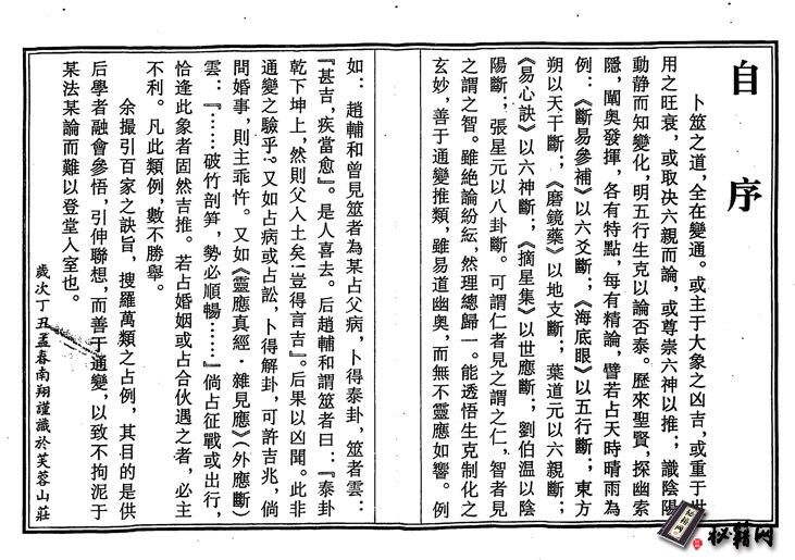 卜 筮 之 道 , 全 在 變 通。 或 主 于 大 象 之 凶吉,或重于世 用之旺衰,或取决六親而論,或尊崇六神以推;識陰陽 動 静 而 知 變 化 , 明 五 行 生 克 以 論 否 泰。 歷 來 聖 賢 , 探 幽 索 隱,闡奥發揮,各有特點,每有精論,譬若占天時晴雨為 例 : 《 斷 易 參 補 》 以 六 爻 斷; 《 海 底 眼 》 以 五 行 斷; 東 方 朔以天午斷;《磨鏡藥》以地支斷;葉道元以六親斷; 《 易 心 訣 》 以 六 神 斷; 《 摘 星 集 》 以 世 應 斷; 劉 伯 温以陰 陽斷 ,張星元以八卦斷。可謂仁者見之謂之仁, 智者見 之 謂 之 智。 雖 絶 論 紛 紜 , 然 理 總 歸 一 。能透悟生克制化之 玄妙,善于通變推類,雖易道幽奥,而無不靈應如響。例 如:趙輔和曾見筮者為某占父病,卜得泰卦,筮者雲: 『甚吉,疾當愈』。是人喜去。后趙輔和謂筮者曰:『泰卦 乾下坤上,然則父入土矣!豈得言吉』。后果以凶聞。此非 通 變 之 驗 乎 ? 又 如占病或占訟,卜得解卦,可許吉兆,倘問婚事,則主乖忤。又如《靈應真經 雜見應》 外應斷 雲: 『… … 破竹剖笋,勢必順暢… … 』倘占征戰或出行’ 恰逢此象者固然吉推。若占婚姻或占合伙遇之者,必主 不利。凡此類例,數不勝舉。 余撮引百家之訣旨,搜羅萬類之占例,其的是供 后學者融會參悟,引伸聯想,而善蓮變,以致不拘泥于 某法某論而難以登堂入室也。