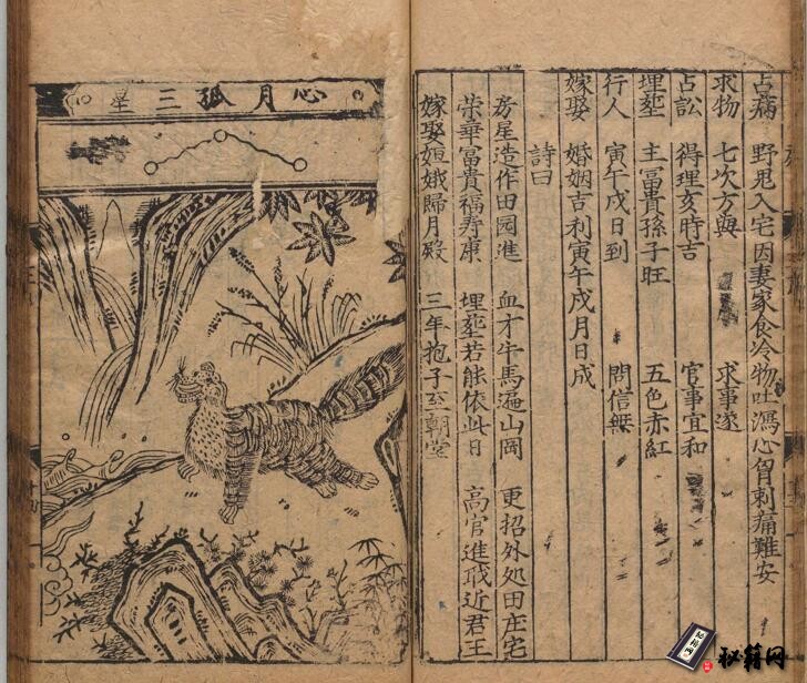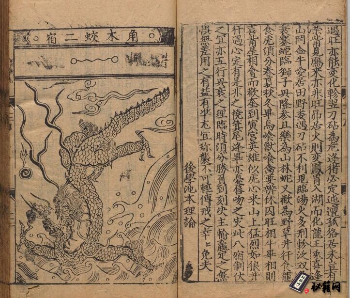 此《新刊禽遁大全》四卷附补全一卷,明池本理著。内容大致是旧时术数家用五行及各禽与二十八宿相配,以定日辰方位的吉凶。书内有相关图释及二十八宿(以各禽为诸宿之神:角木蛟、亢金龙、氐土貉、房日兔、心月狐、尾火虎、箕水豹、斗木獬等)插图。此为明弘治09年进贤书舍刊本。