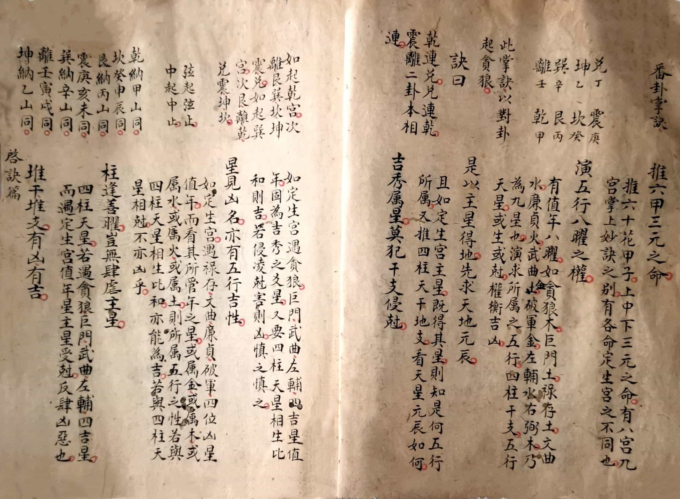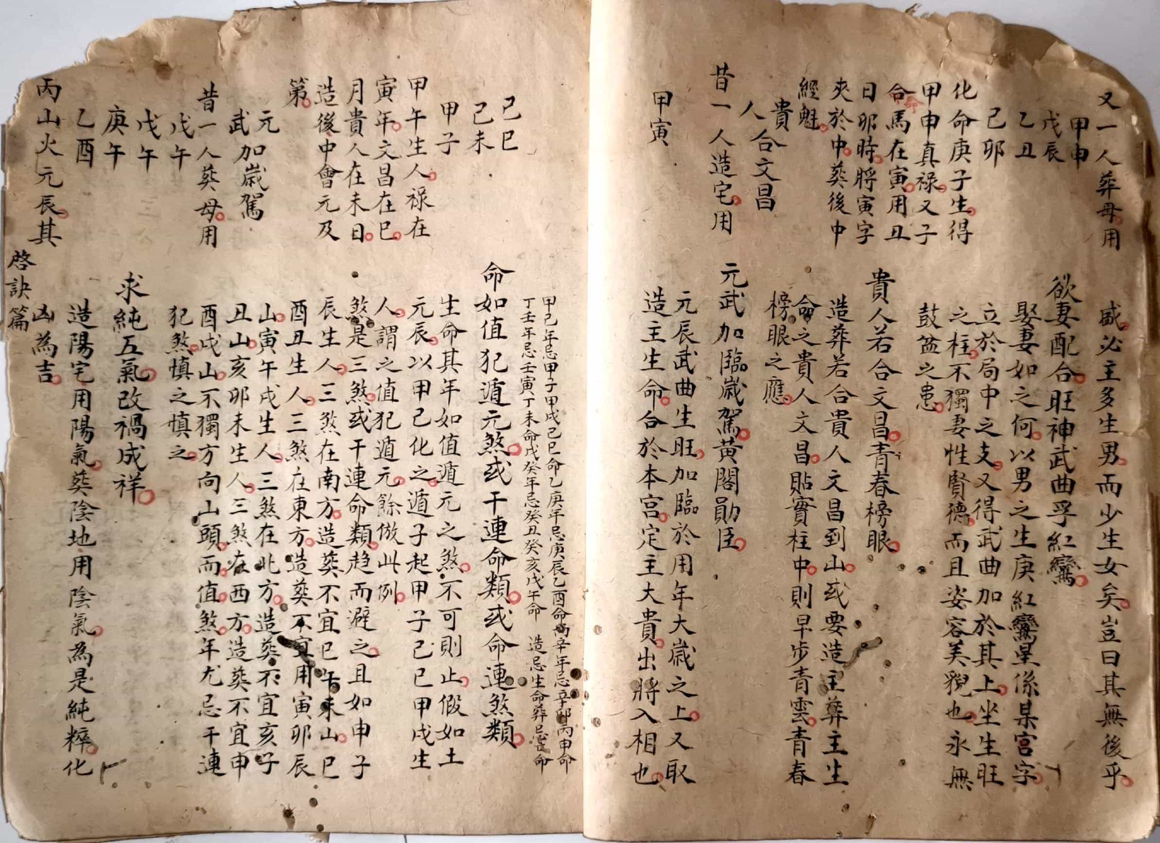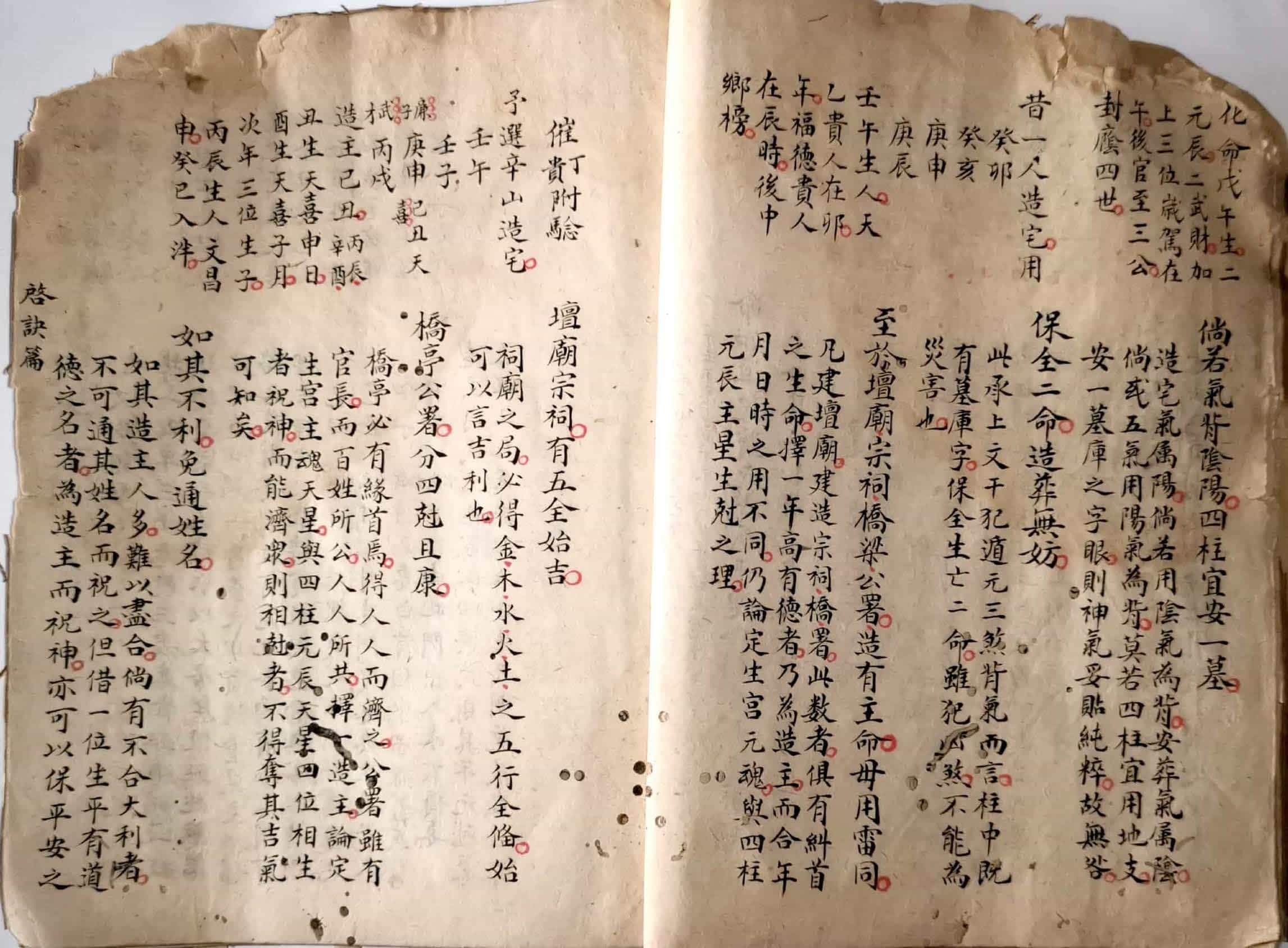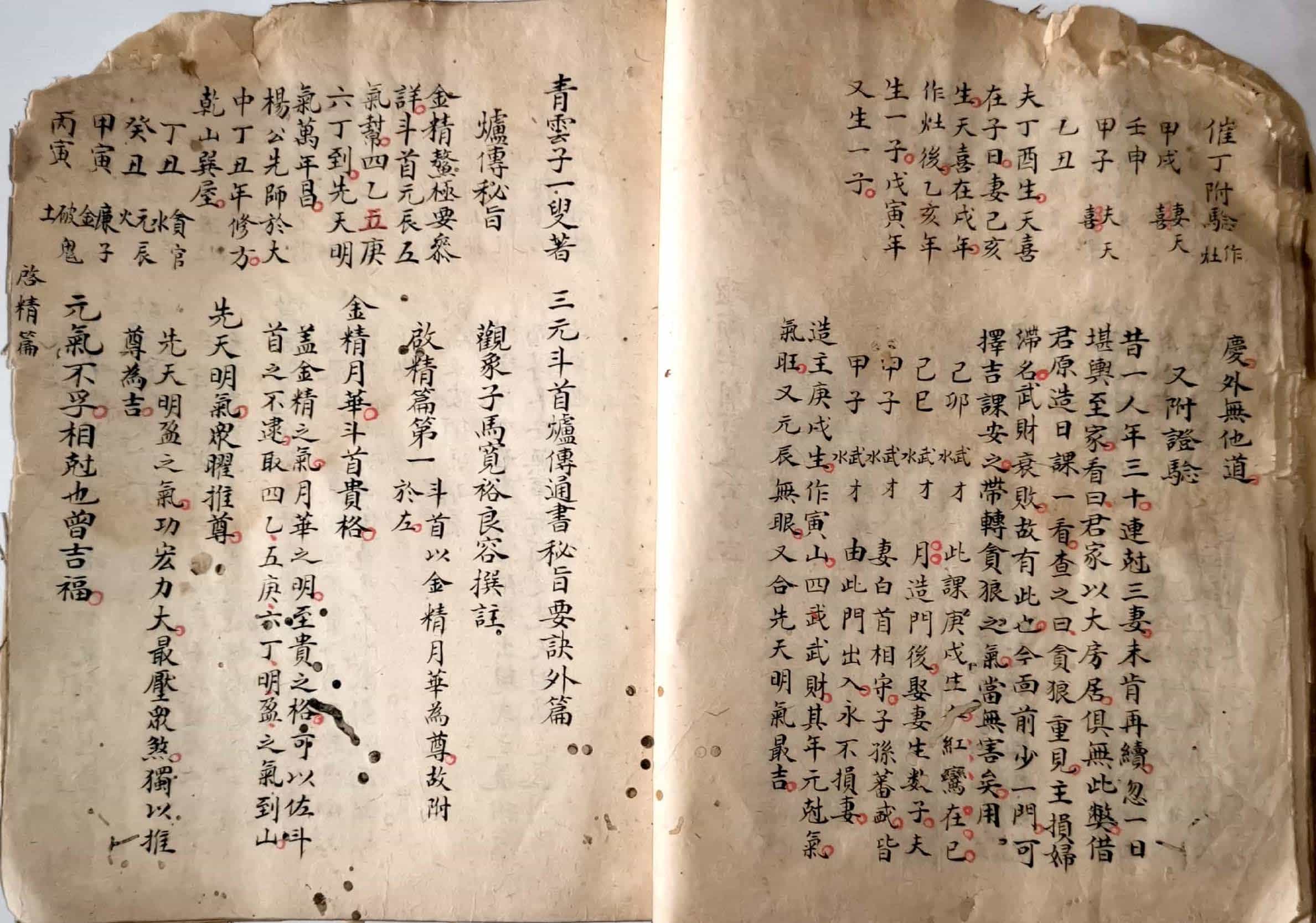 《炉传秘旨》,三元斗首炉传通书秘旨要诀外篇,青云子一叟著,观象子马宽裕良容撰註,全本共36个双面,部分页面有破损和虫蛀。