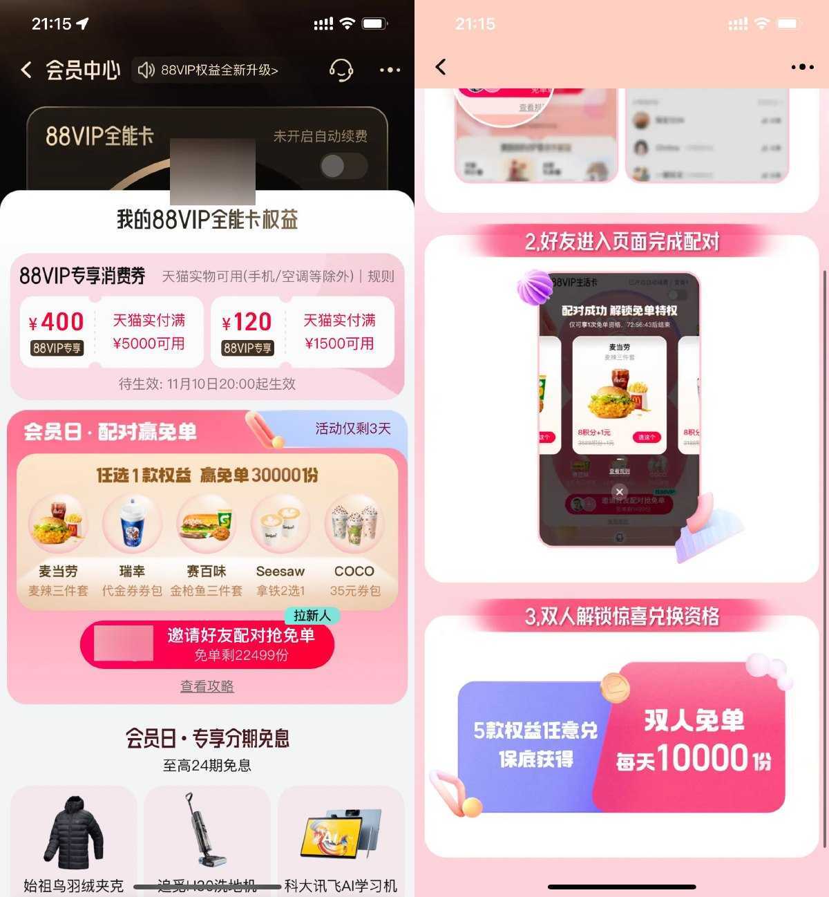 1、淘宝APP搜索“会员中心”->邀请1名好友配对抽免单