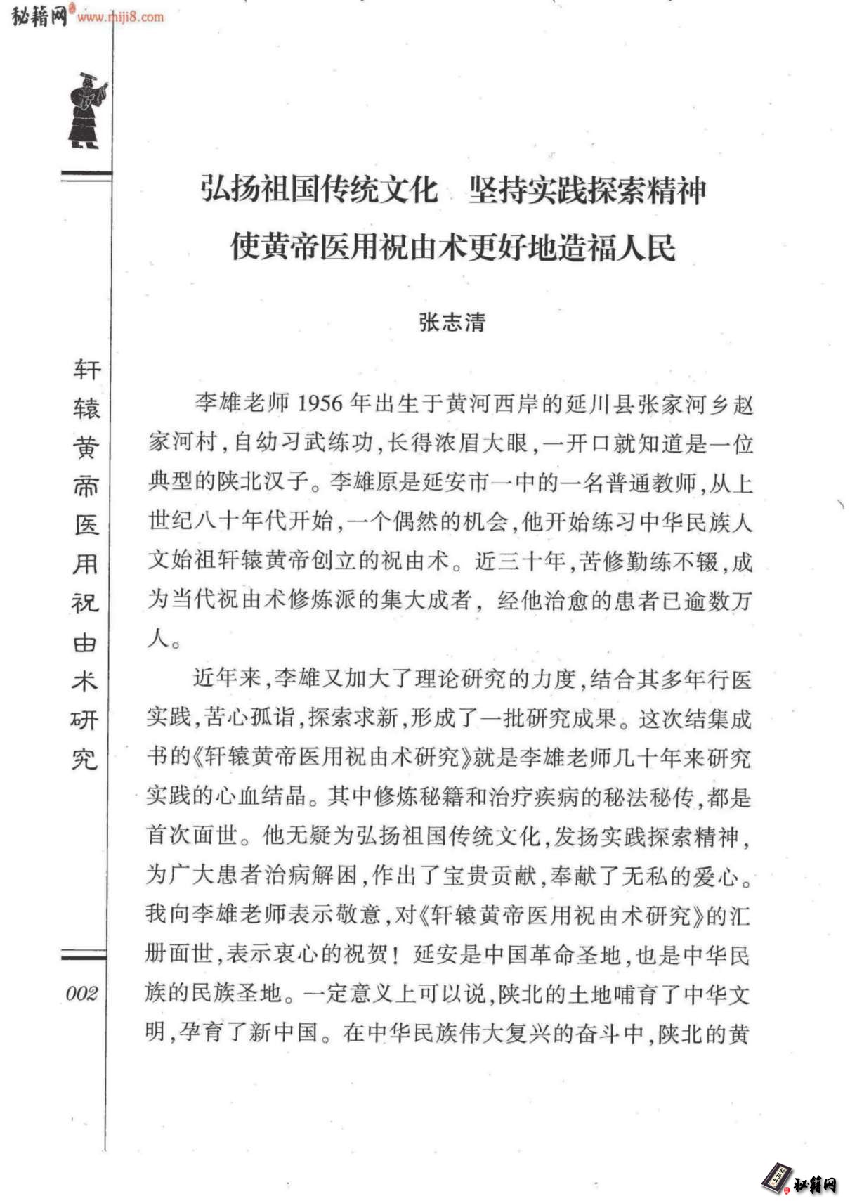我向李雄老师表示敬意,对《轩辕黄帝医用祝由术研究》的汇册面世,表示衷心的祝贺!延安是中国革命圣地,也是中华民002|族的民族圣地。一定意义上可以说,陕北的土地哺育了中华文明,孕育了新中国。在中华民族伟大复兴的奋斗中,陕北的黄 土地必将做出新的贡献。有学者认为,必须以文化复兴的大视野、大襟怀来重新审视黄帝医用祝由术。在文化复兴的征程中,文明成果具有决定意义。复兴之路,就是要把传统文化中真正优秀的、有益的,有生命力的文明成果加以总结,提高创新,去伪存真,去粗取精,逐步完善,发扬光大。我是赞同这一观点的。李雄老师从事的工作,其意义也就在这里。《黄帝内经》面世2000多年来,为中华民族的生存繁衍和传统的中医|轩药事业发展作出了极其宝贵的贡献。直到今天都奉为圭桌。|转黄帝医用祝由术,则是其中不可忽视的重要一支。我们今|黄天在黄帝生活、奋斗过的地方,回溯黄帝医用祝由术所发挥过|而的重要作用,研究其“移精变气”,“治未病”为博大精深的科学|医内涵,探索其尚未被现代科学破解的千古之谜,足以还其一个|用可以让广大人民群众能够理解、认同的宽松和谐局面,为广大|祝