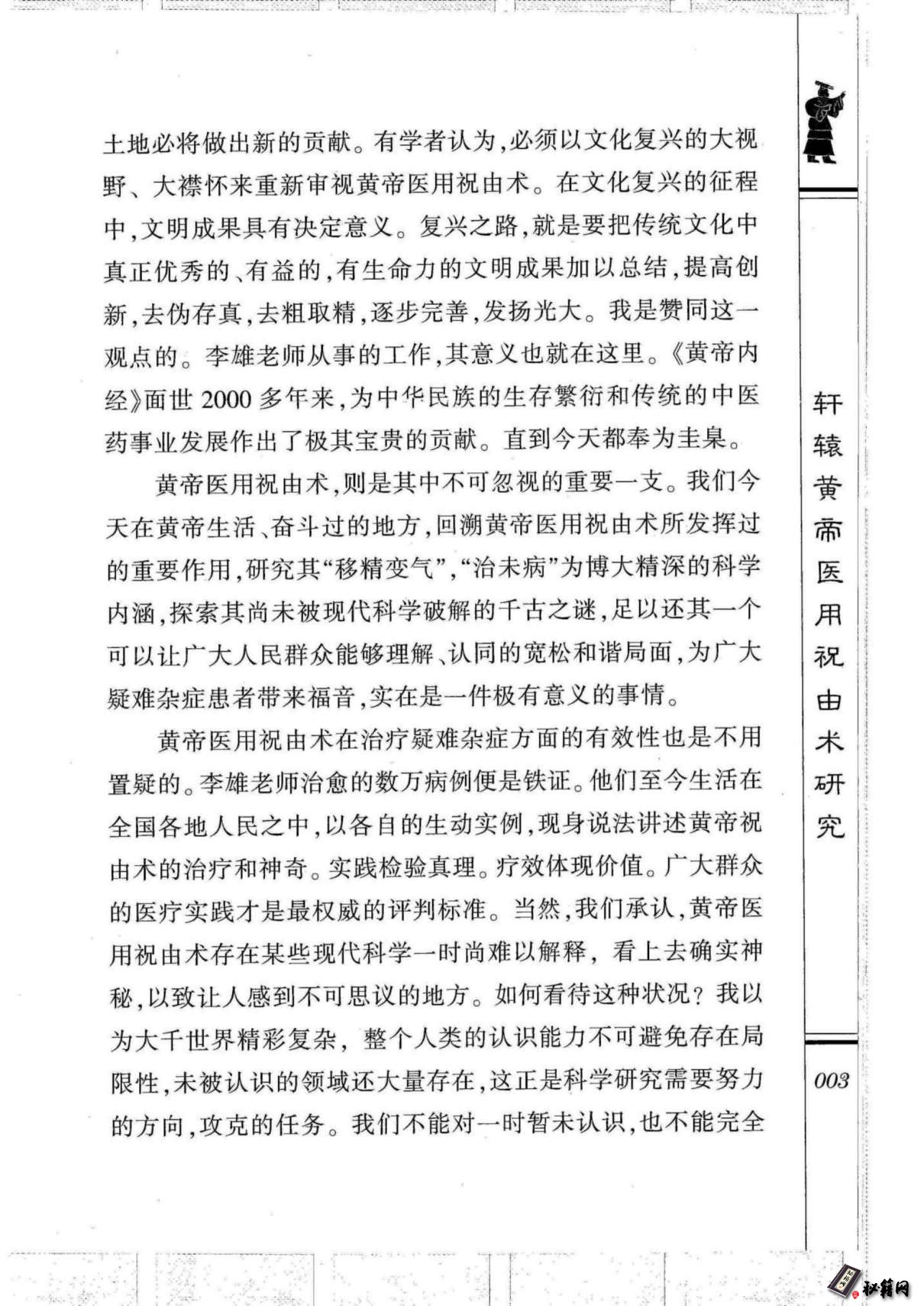 效性,因此才有如此强大的生命力,现仍有大量疑难杂症未被|由攻克,祝由术在这方面可发挥其独特的作用。李雄老师编著的|术《轩辕黄帝医用祝由术研究》一书,是其多年临床实践的总结。|研该书系统介绍了祝由术的发展历史,修炼、应用的要旨,为一|犹本不可多得的祝由术专著。在值该书即将付梓之际,谨以此为序。