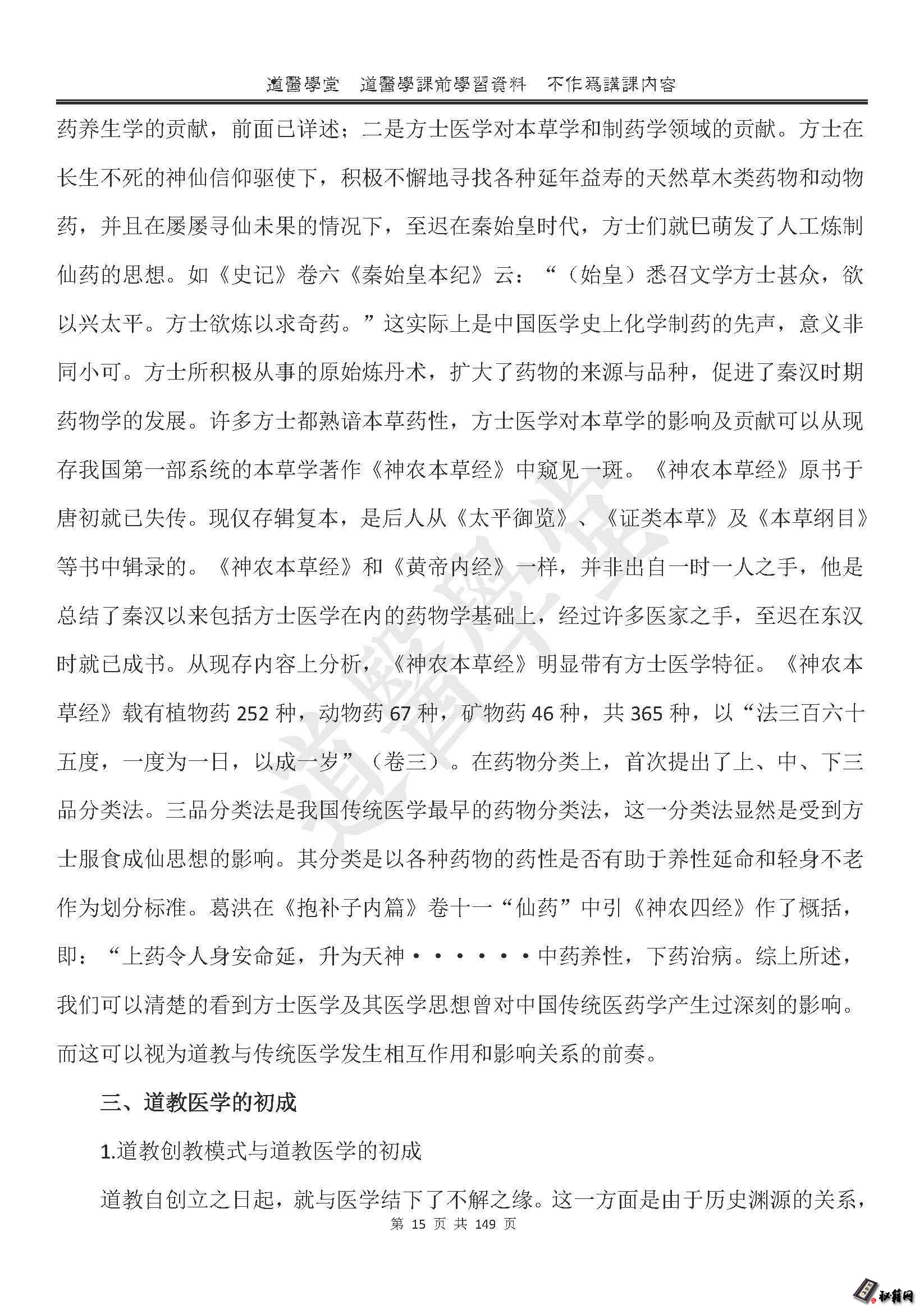正是在这一宗教与医学相互交融的历史过程中,道教医学得以逐渐产生,并经过汉魏两晋南北朝道教名士对传统医学不断融摄与创发,初步形成了中国传统医学的一个流派。就其历史渊源而言,道教医学的源头可以远溯道原始宗教之巫术医学,而他的直第7页共149页