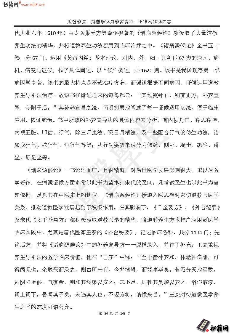 道需攀堂道需翠课前琴智资料不作焉蔬踝内容道教医学发展史、道教医学思想、道教医学疗法等方面。道教医学的一个分支内丹学的研究也有所进展,作为集传统医学养生学之大成的内丹学蕴含着深刻的内丹医学思想,相关研究涉及内丹医学的体系、理论内容与特征、心理学本质、生命哲学思想等方面。此外由于道教医学具有很强的历史继承性、包容性与实践性。因此,学习道教医学需要注重研究构成其思想的核心,即从道家、道教思想、传统医学思想等方面把握其独特的生命观、疾病预防治疗观;道教医学涉取与包容了以往所有医学成就的精华,博大精深,因而需要从各个角度探讨其医学思想的本质特征;道教医学的实践性特征,主要表现为它作为医疗养生技术方面,这决定了学习者需要联系实际,通过自身的不断深入体验,掌握其技术要领。