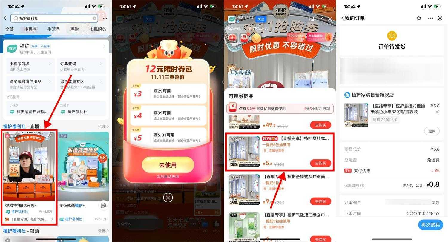 支付宝搜索“植护福利社”->点下方直播进入->等待10秒左右自动弹出券包,找到带有“官方补贴”字样的抽纸购买就行了