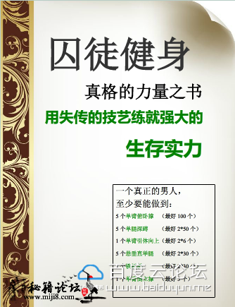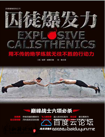 封面及目录截图 在线面哦 !!! 介绍: 这不是一本教你练出“可爱肌肉”的书,而是一本教你练出能用的力量、极限的力量、生存的力量的书。作者保罗·威德在美国最严酷的监狱中 度过了19年,在其中逐渐挖掘出了一套最古老的健身法,在商业社会中早已失传的力量哲学,并凭此成为了地球上最强壮的人之一——这让 他 得以有尊严地生存下来。出狱之后,他把这套失传的技艺整理并公之于世——这是他带给我们的最珍物。 生存下去,至少要有:钢筋铁骨的双手及前臂,守护脑袋的终极脖颈,永动机般的小腿,无懈可击的侧链肌肉,刀枪不入的关节,越受伤越强大 的自愈力。