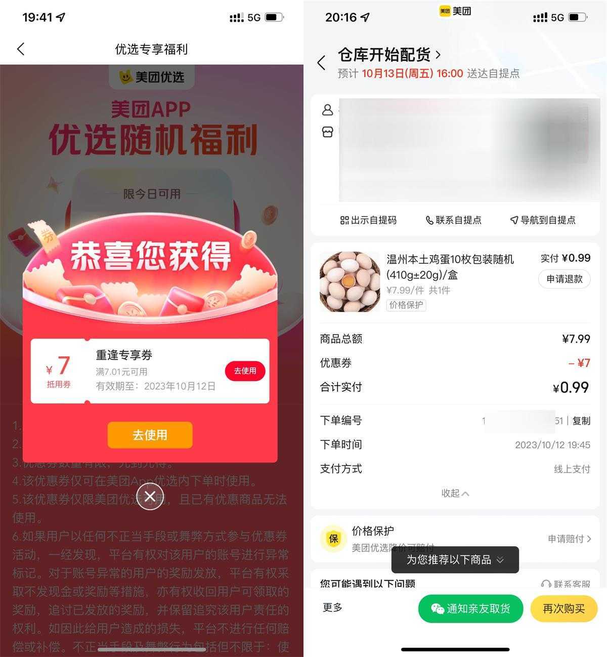 美团APP扫码->直接抽7.01减7元券->随便买点啥都行,需要自己次日到自提点自取