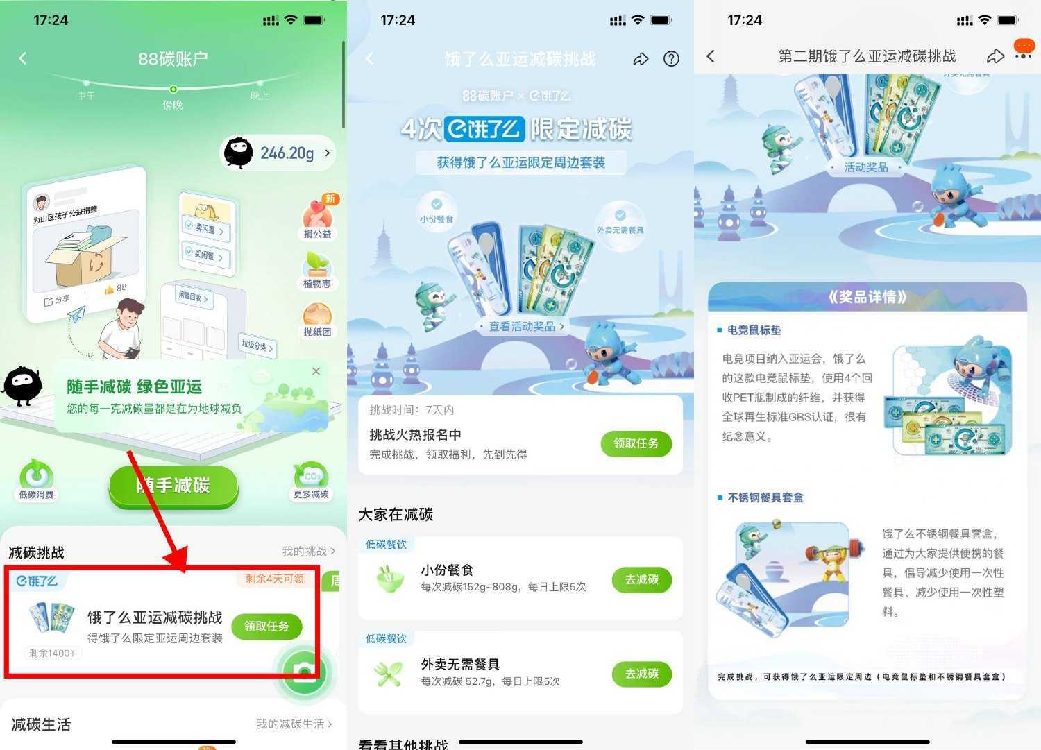 10月2日置顶新一期1、淘宝APP搜索“88碳账户”->报名一下饿了么亚运挑战2、饿了么点外卖减碳4次就可以领鼠标垫或不锈钢餐具