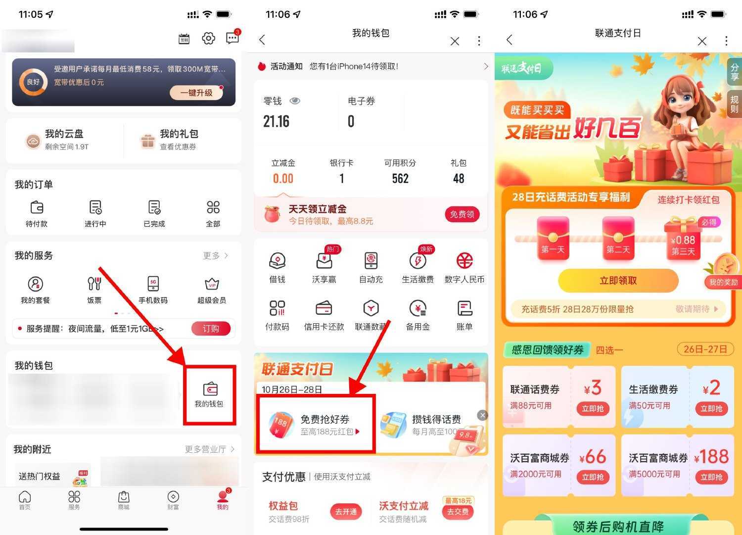 2023-11-26置顶新一期联通APP->我的->我的钱包->联通支付日->每天签到得随机话费券,第3天必得0.88元话费券