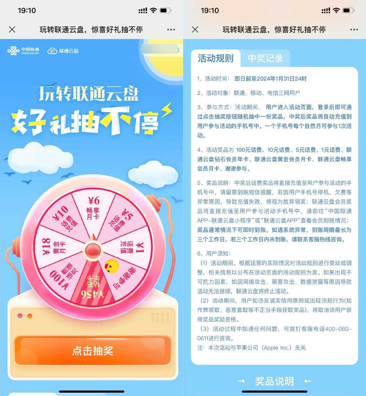 打开地址->有1次机会直接抽->只有联通才能抽中话费,电信和移动只能中会员