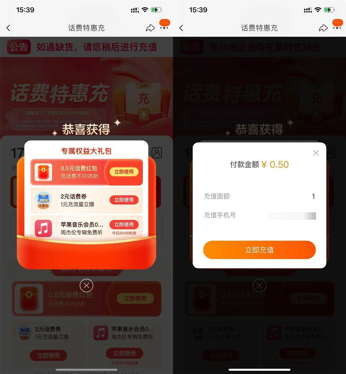 淘宝APP扫码->自动弹出0.5元话费券->电信用户0.5充1亓话费