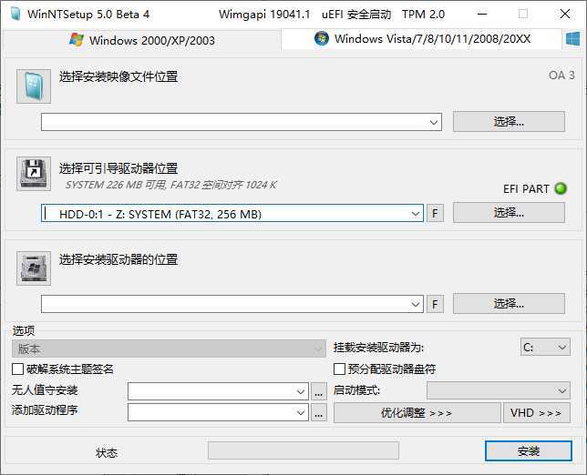 WinNTSetup,系统安装利器,目前最好用的系统安装器,Windows系统安装部署工具。支持所有Windows平台,支持多系统安装、完全格式化C盘、支持创建VHD虚拟硬盘、在Windows及PE系统下运行,允许在安装前对系统进行预优化设置、集成驱动程序、启用第三方主题支持、加入无人值守自动应答文件等操作。