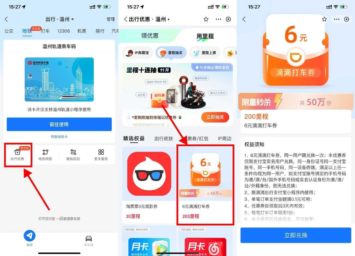 支付宝首页“出行”->出行优惠->满200里程可以兑换6元滴滴打车券