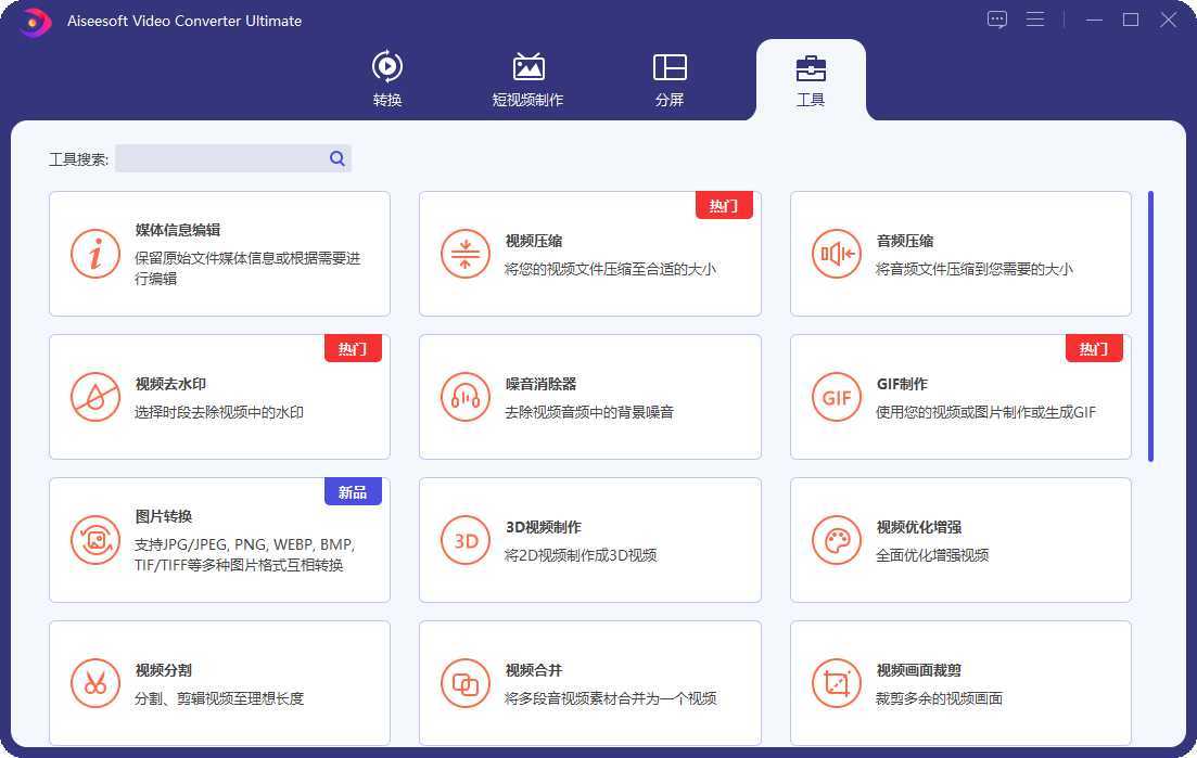 软件介绍Aiseesoft Video Converter Ultimate中文破解版(视频转换大师)是一款强大的视频转换软件多功能媒体转换工具,Aiseesoft Video Converter中文注册版视频格式转换器可以将任何的视频转换为各种高清视频格式.软件截图版本特点- AiseesoftV