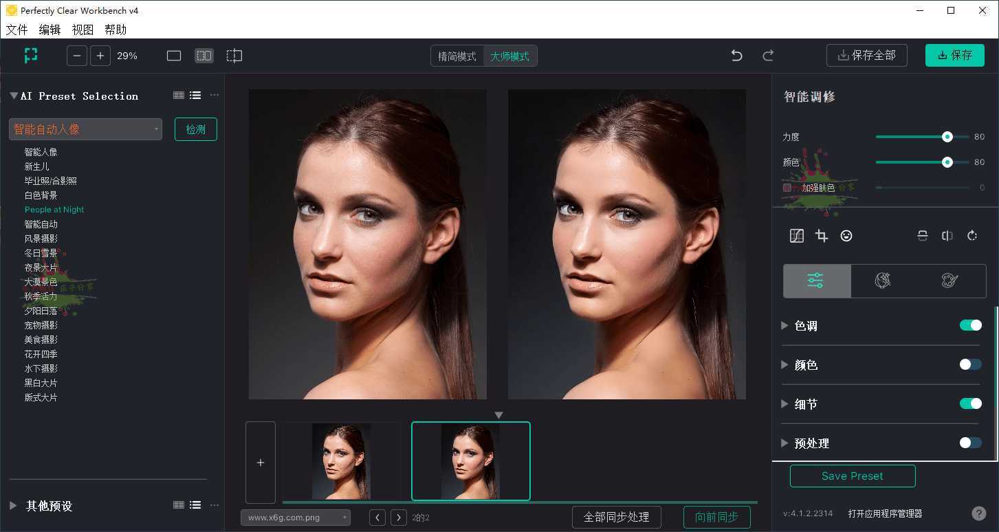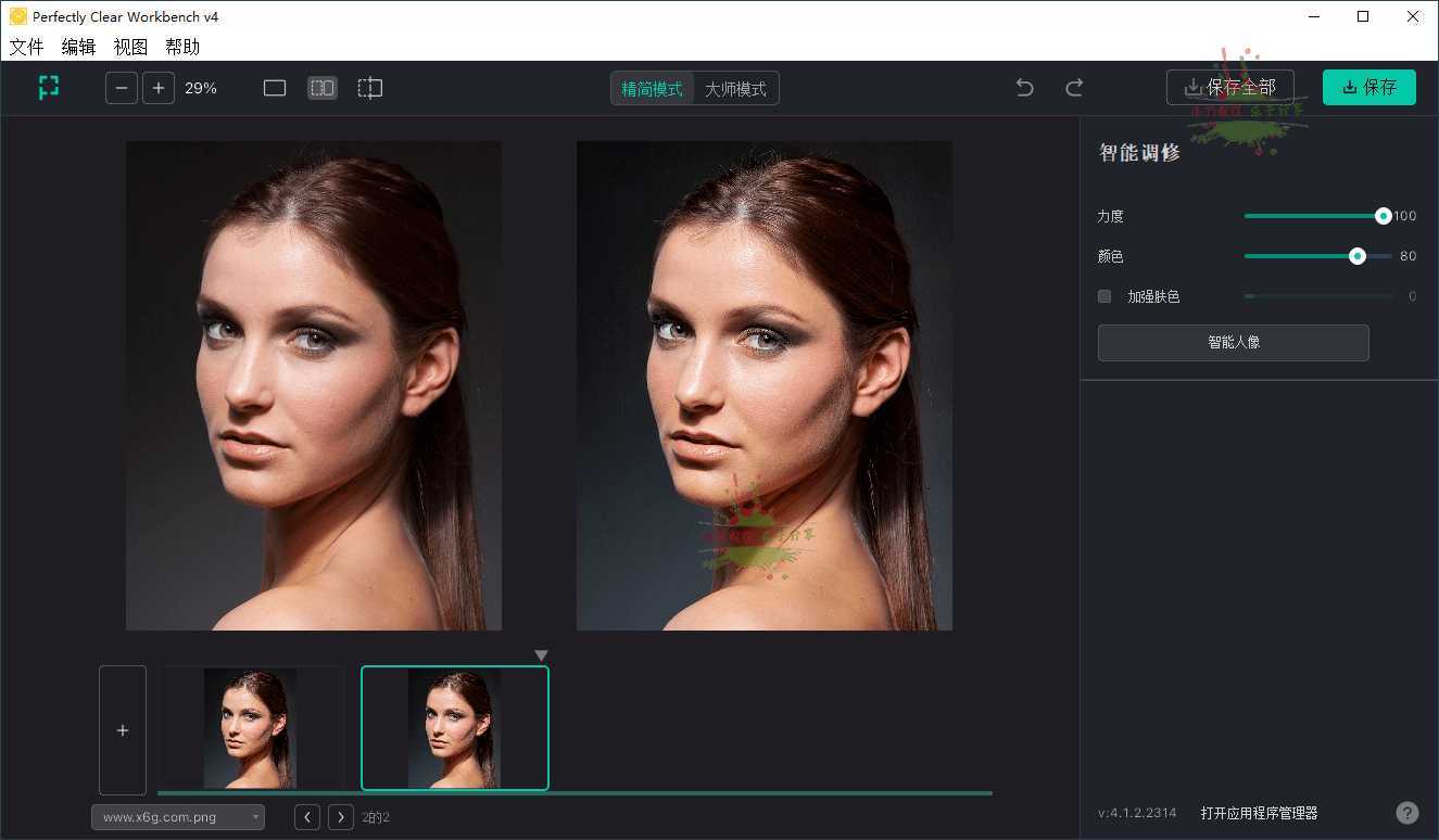 Perfectly Clear WorkBench中文版是全球领先的智能图像校正技术商推出的图像清晰处理软件,这款智能图像处理软件的照片自动校正技术,智能处理图像,自动校正照片,例如:去瑕疵,去红眼,去黑眼圈,皮肤软化等.