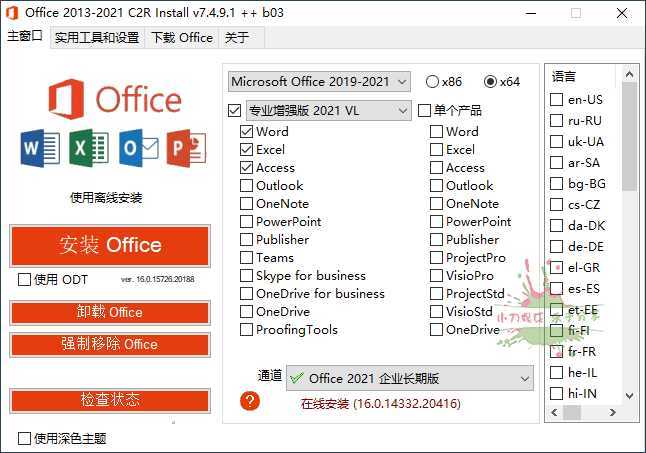 Office 2013-2019 C2R Install是由俄罗斯人Ratiborus制作的Microsoft Office下载、安装、管理的自定义部署工具。它可以在线下载安装 Office 2013-2021 的各个版本,离线安装部署Office镜像,自定义安装Office产品组件,支持Office零售版转换批量许可版,在线KMS激活Office,可选内置Office密钥许可证安装。
