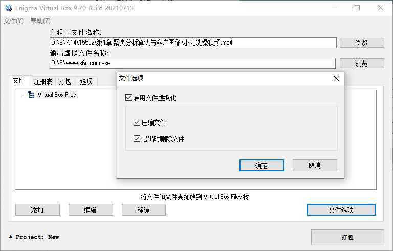 Enigma Virtual Box虚拟打包器,免费虚拟文件打包工具,单文件制作工具、软件虚拟化工具。利用该文件虚拟工具可以将多个文件封装到应用程序主文件,程序和配套文件打包成一个可执行文件,配套文件也不会被释放至硬盘,从而制作成为单执行文件的绿色软件。它支持所有类型的文件格式,虚拟化后的程序不释放任何临时文件到硬盘,文件虚拟过程仅在内存运行。该软件的功能有独立免费程序,同时支持X86和X64二进制文件。