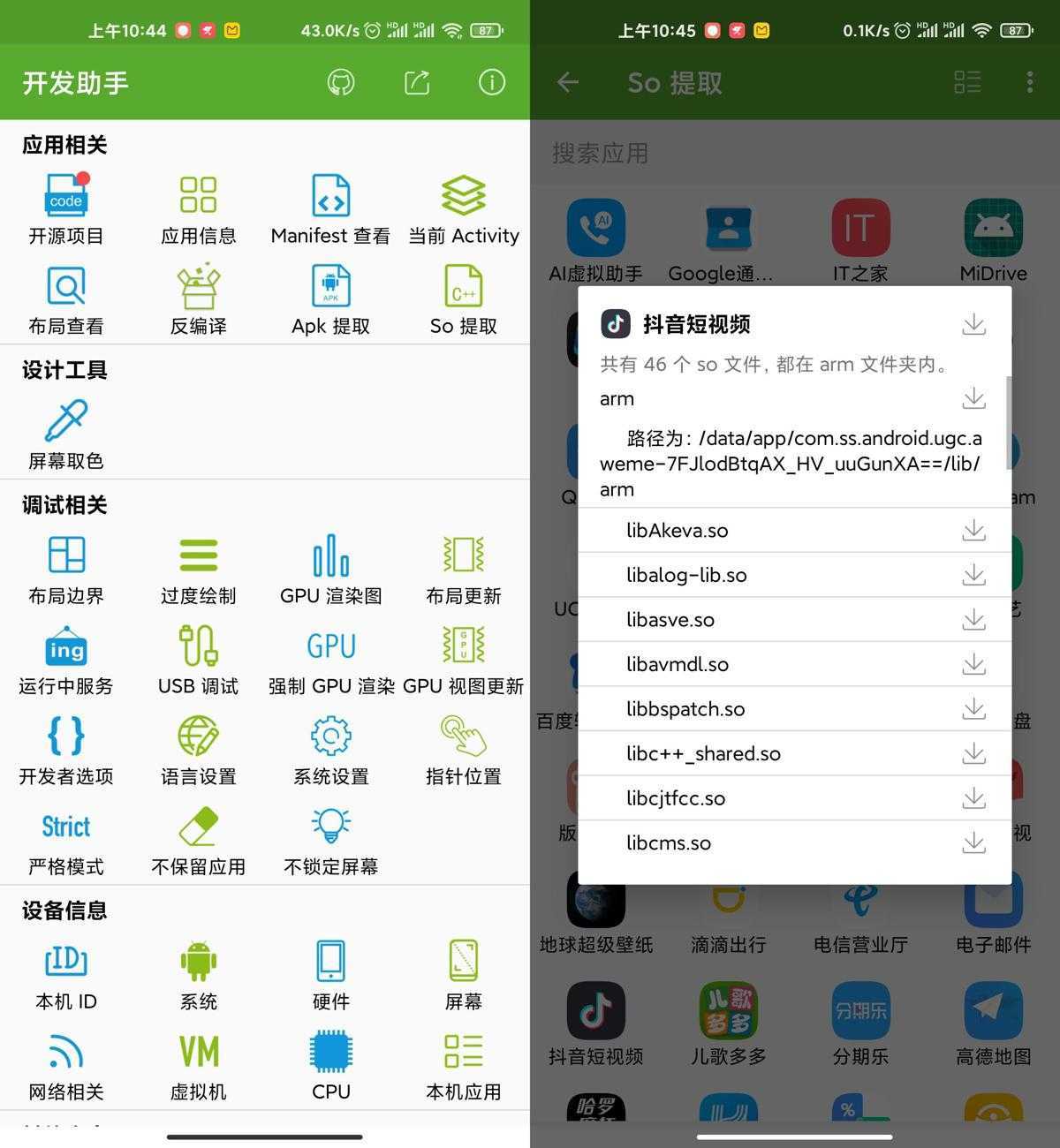 Android开发助手是个强大的Android开发工具,能够用来反编译其他应用、查看其他应用布局和控件信息、屏幕取色(颜色取样器)、查看Activity历史记录、查看应用Manifest、查看最近使用和最近安装的应用、提取任何应用Apk和So文件、查看开源项目、调试应用、查看手机软硬件信息等,后续添加更多功能。