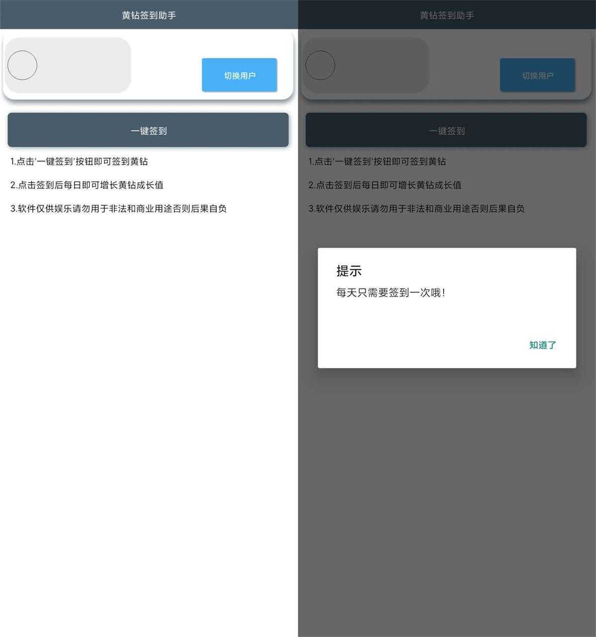 还在为QQ更新后找不到黄钻签到在哪儿浪费时间吗?黄钻签到助手APP只需轻轻一点即可完成黄钻每日签到,轻松完成签到任务获取黄钻成长值。