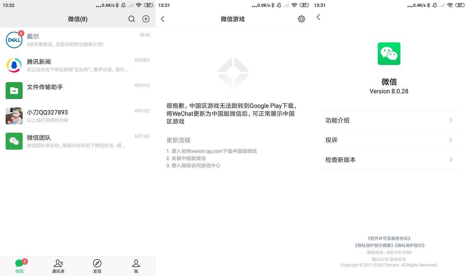 软件介绍微信已经变成一种生活方式,很多人都离不开吧,国内第一APP这个称号不为过,微信Android版正式版完整安装包微信谷歌版(WeChat)特点:隐私条款较严,耗电量比较少,不会个性化推荐广告,不会监测用户聊天数据,没有强制升级弹窗.软件截图如何区分微信是不是谷歌版方法1、点开发现页->游戏,如