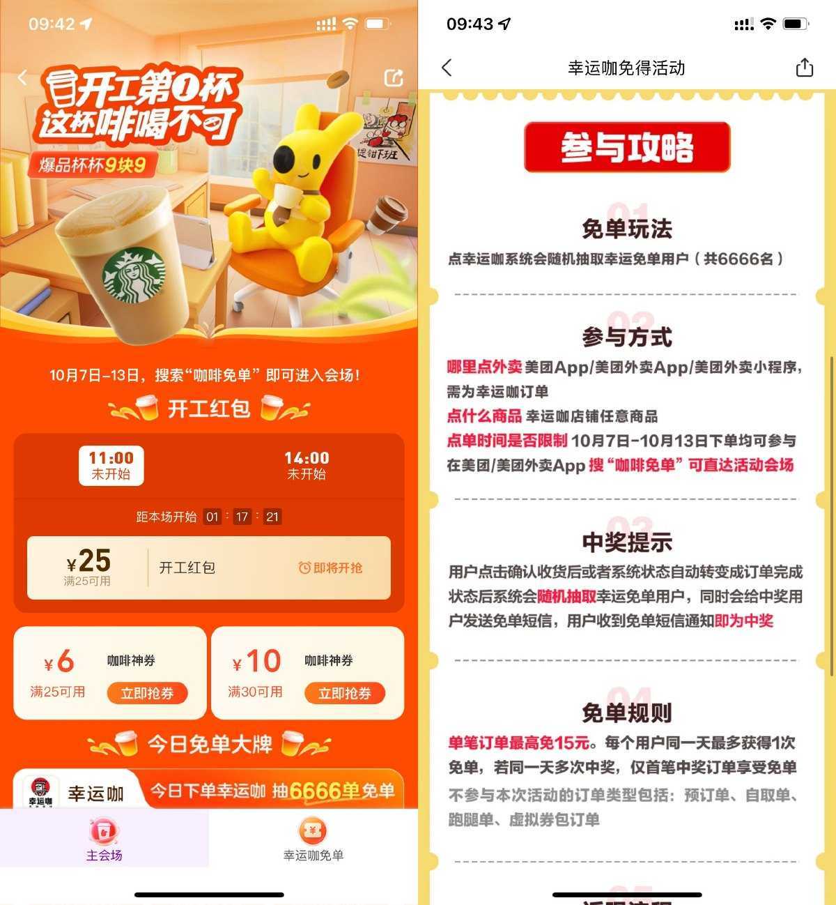 美团APP搜索“咖啡免单”->每天11/14点整抢25元通用咖啡券->每天还有幸运咖店铺随机免单活动