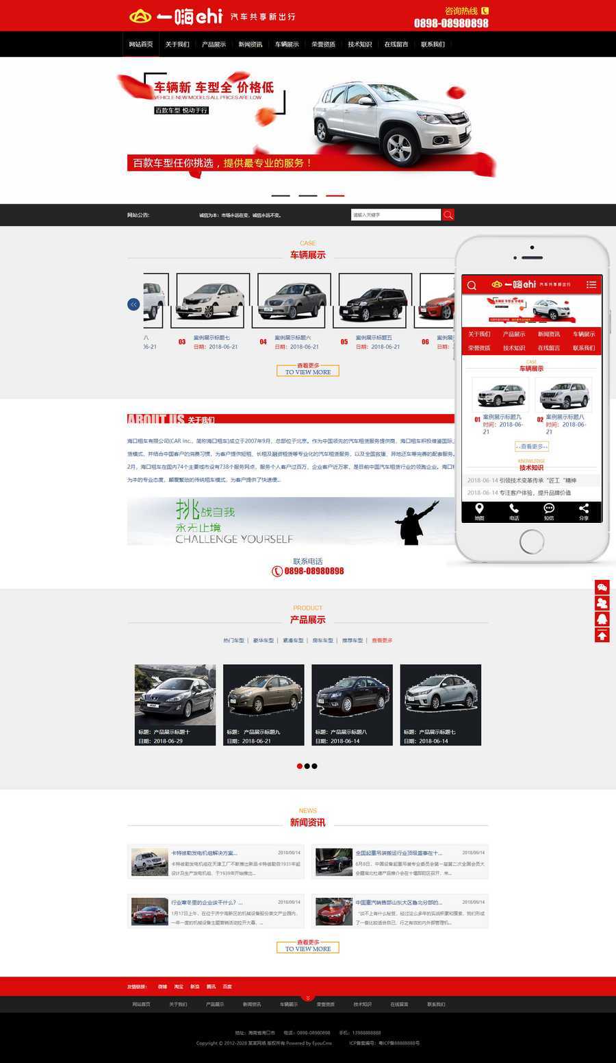 易优CMS汽车车辆租赁类网站模板,EyouCMS汽车相关类企业网站模板。适用于汽车、汽配、交通、物流类企业网站开发使用。模板自带eyoucms内核,无需再下载eyou系统,原创设计、手工书写DIV+CSS,完美兼容IE7+、Firefox、Chrome、360浏览器等;主流浏览器;结构容易优化;多终