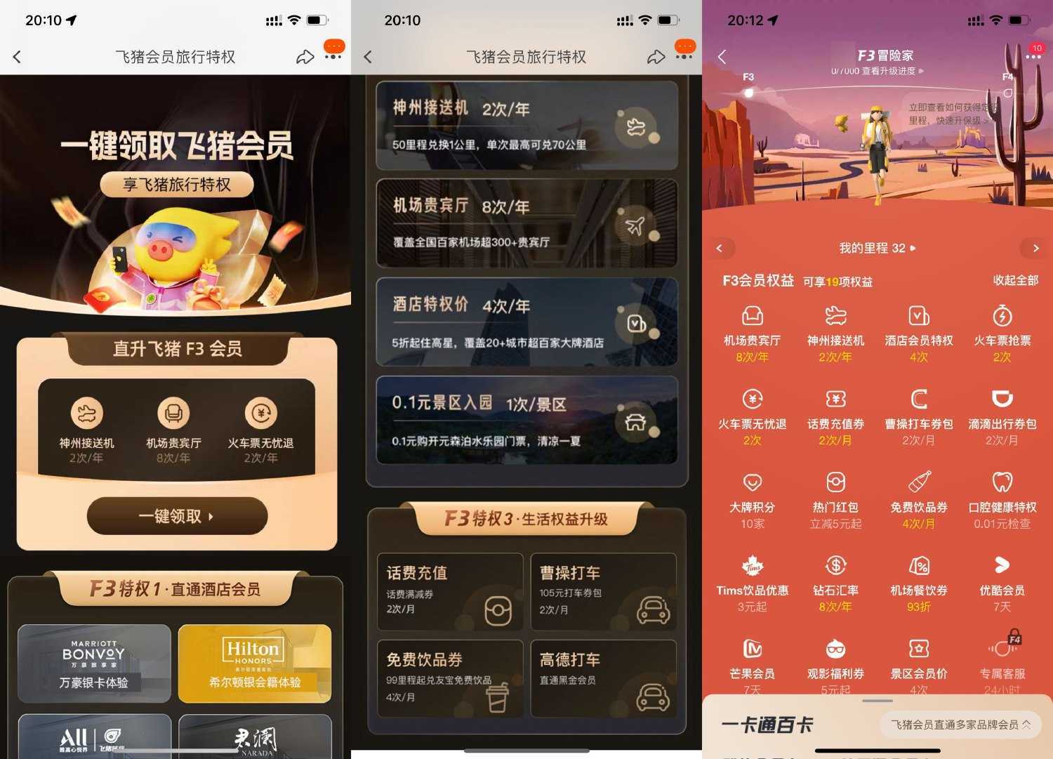 淘宝APP扫码->直接领取->飞猪秒升F3会员,有效期3个月