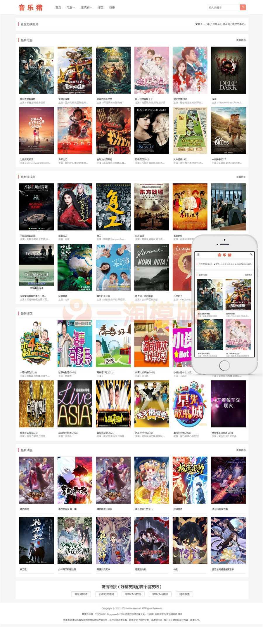 苹果CMSv10音乐猪自适应通用影视电影网站模板,已测试,完美无错。
