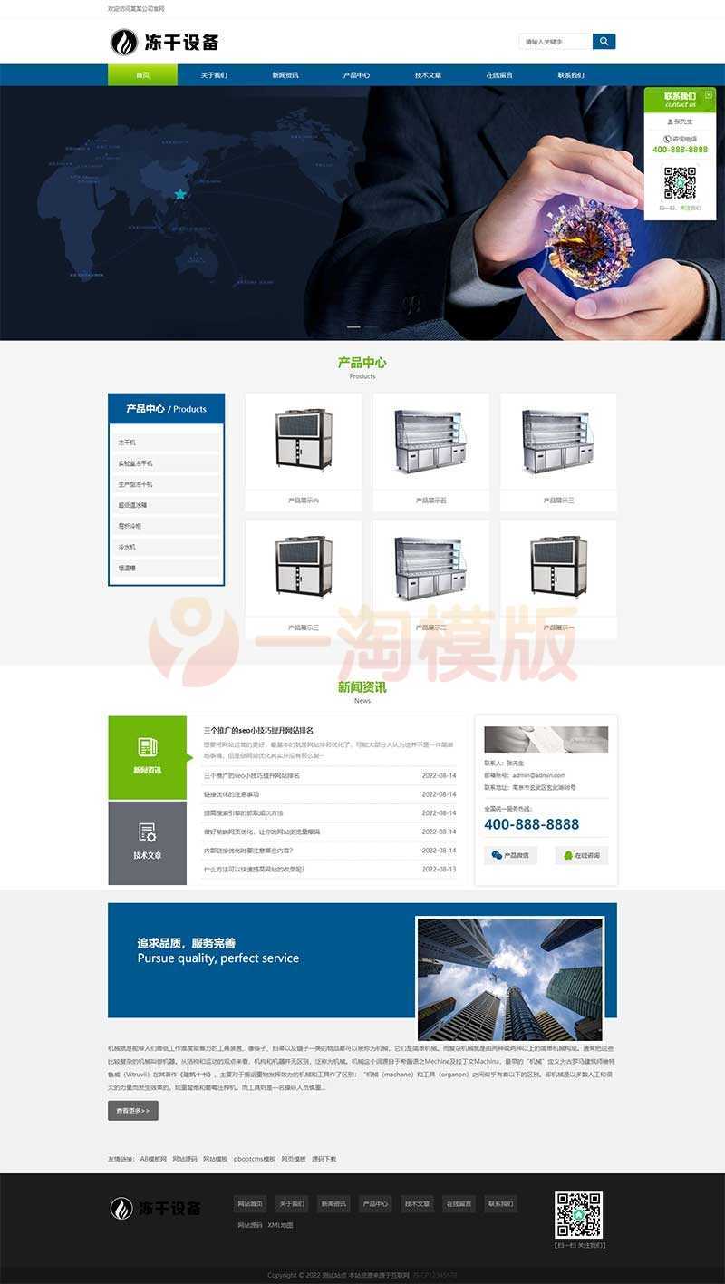 HTML5冻干机冷冻设备pbootcms模板/蓝色冷冻机械设备网站源码下载