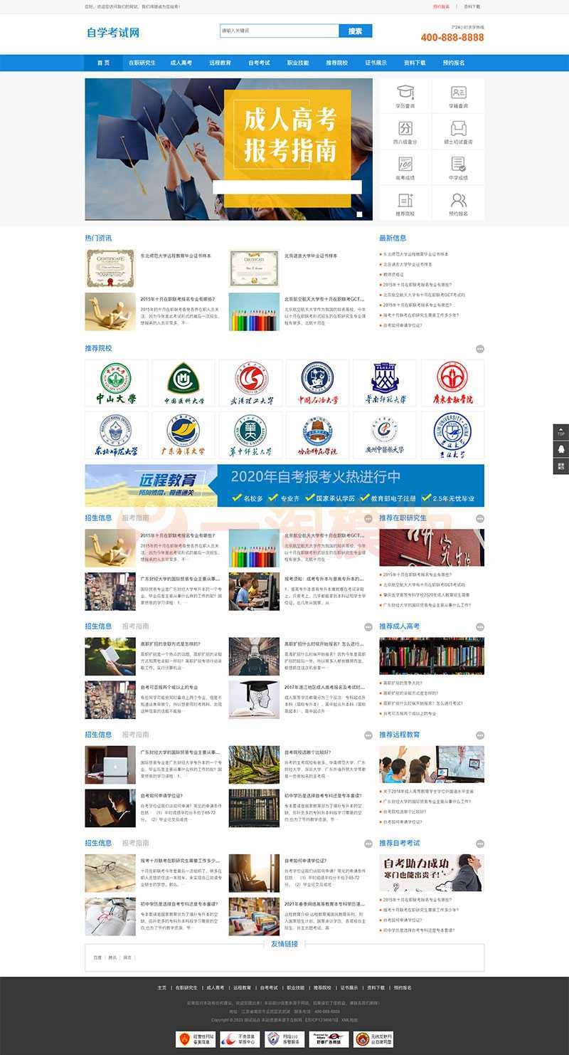 PbootCMS内核开发的网站模板,该模板适用于成人考试网站、教育考研网站等企业,当然其他行业也可以做,只需要把文字图片换成其他行业的即可;