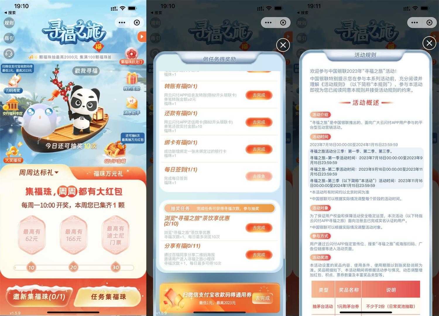 云闪付APP搜索“寻福之旅”->每天简单游戏得福珠和抽奖次数,累计10/20/30福珠抽消费红包,集齐50/100福珠开启终极大奖