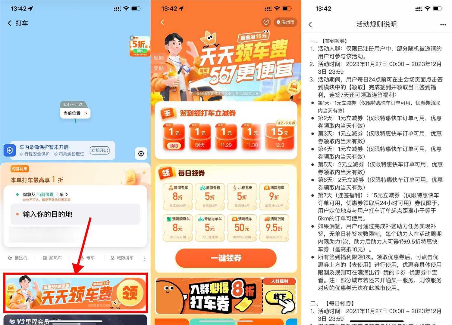 2023-11-27新一期滴滴出行APP或小程序->横幅“天天领车费”->连续签到7天领15元打车立减券