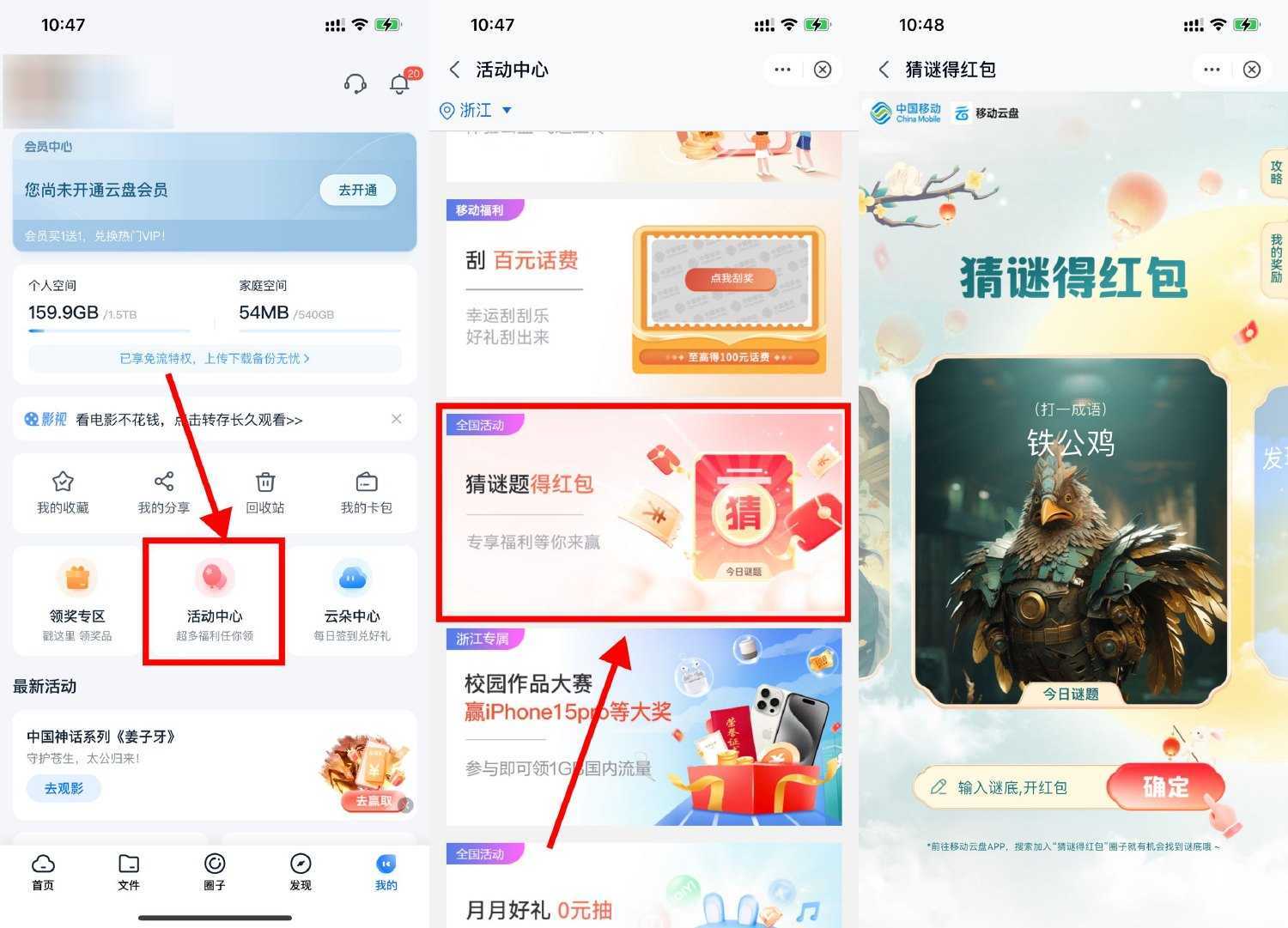 移动云盘APP->我的->活动中心->猜谜题得红包->百度搜一下灯谜,答对抽立减金