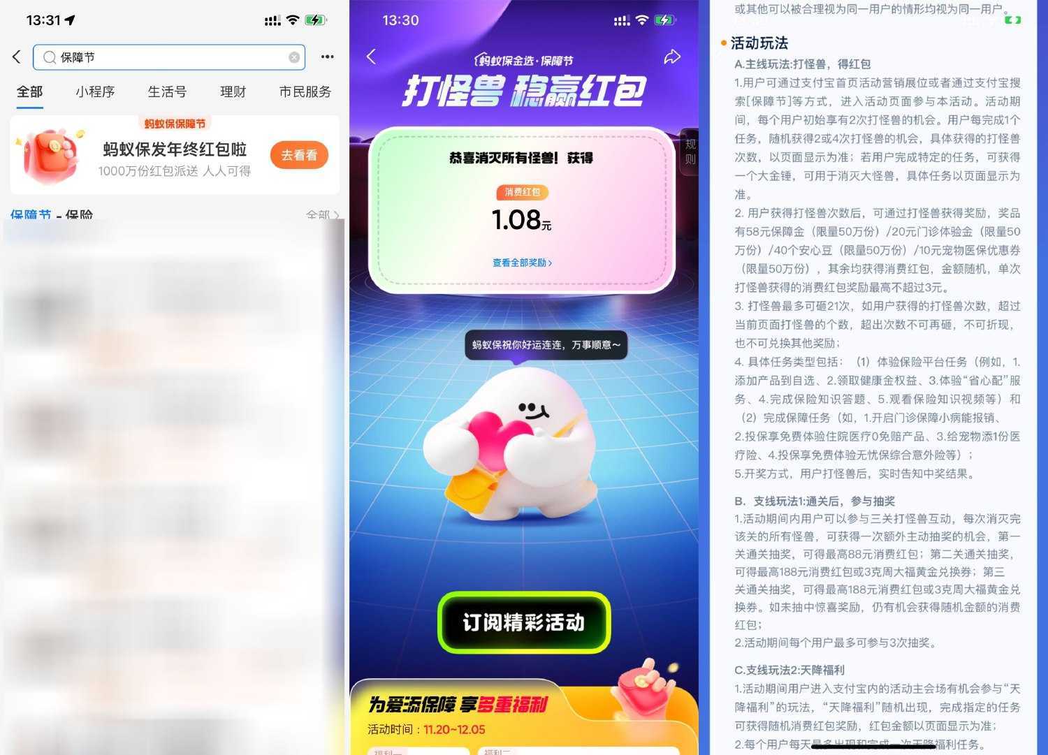 支付宝搜索“保障节”->点击横幅进入->简单浏览得次数打怪兽得消费红包