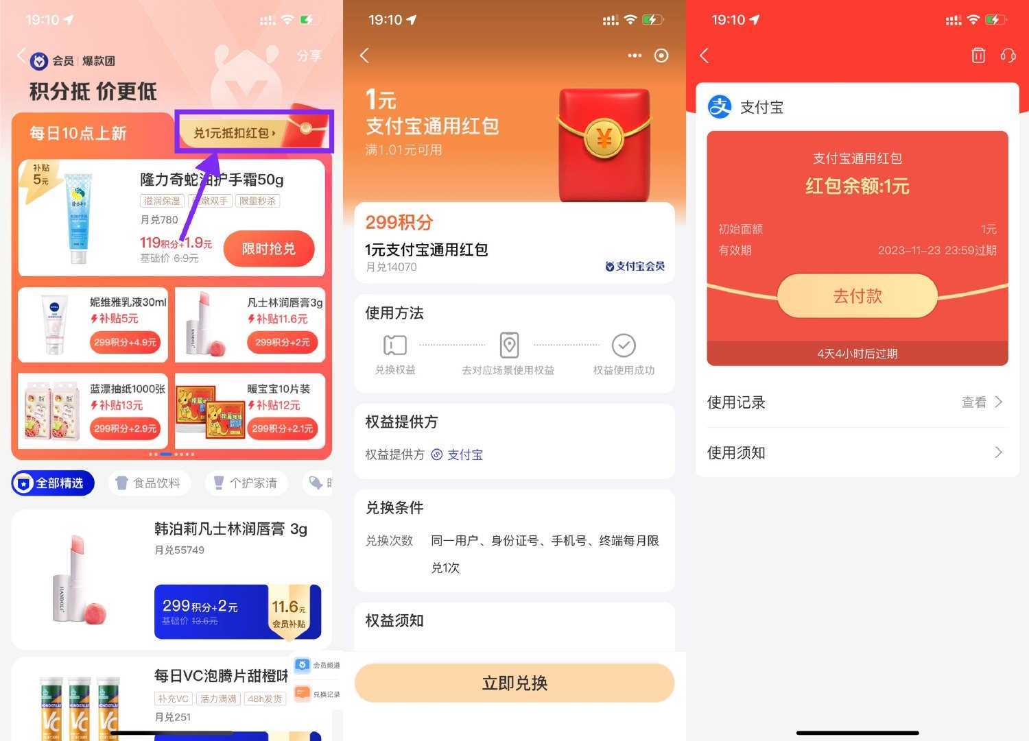 支付宝APP扫码->点右上角进入->使用299积分兑换1元通用红包