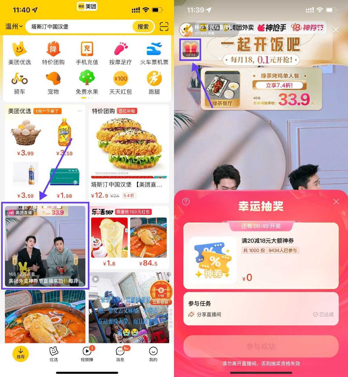 美团APP->点顶部进入直播间->进入右上角礼盒->每20分钟抽1000张20减18元外卖红包