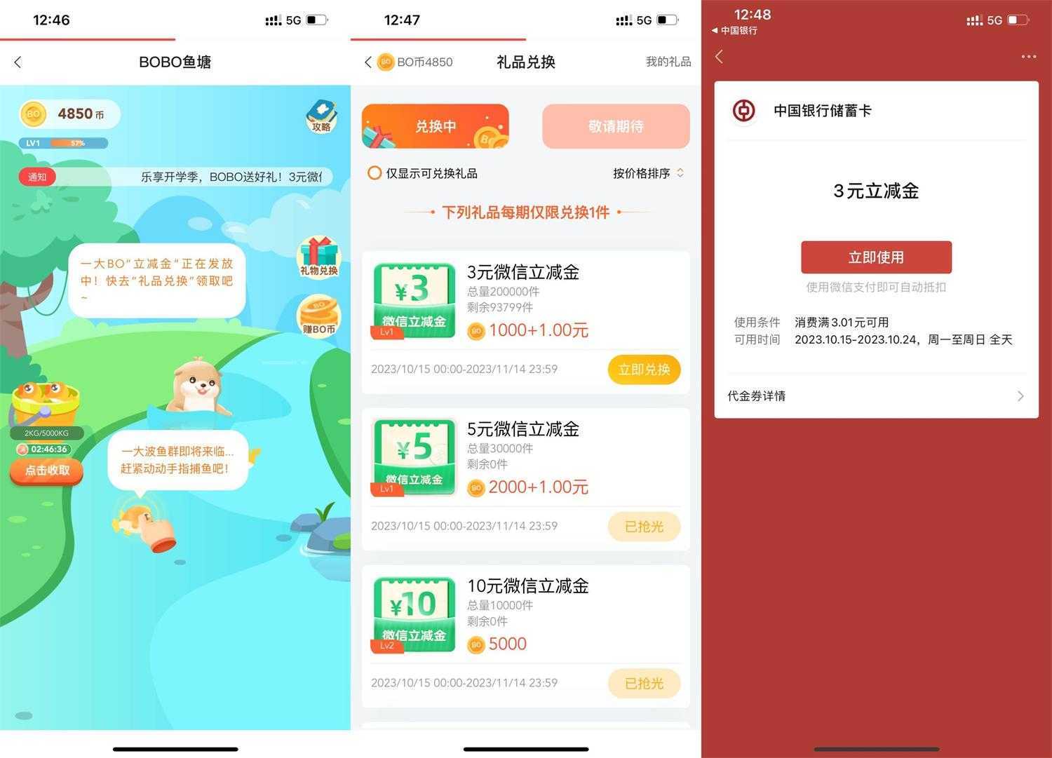 中行APP搜索“BOBO鱼塘”->做任务赚BO币->使用1000BO币+1元兑换3亓微信立减金
