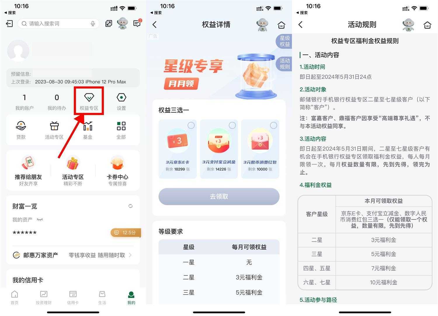 邮储银行APP->我的->权益专区->福利金->直接领取3~10元京东E卡或支付宝立减金,等级越高领的越多