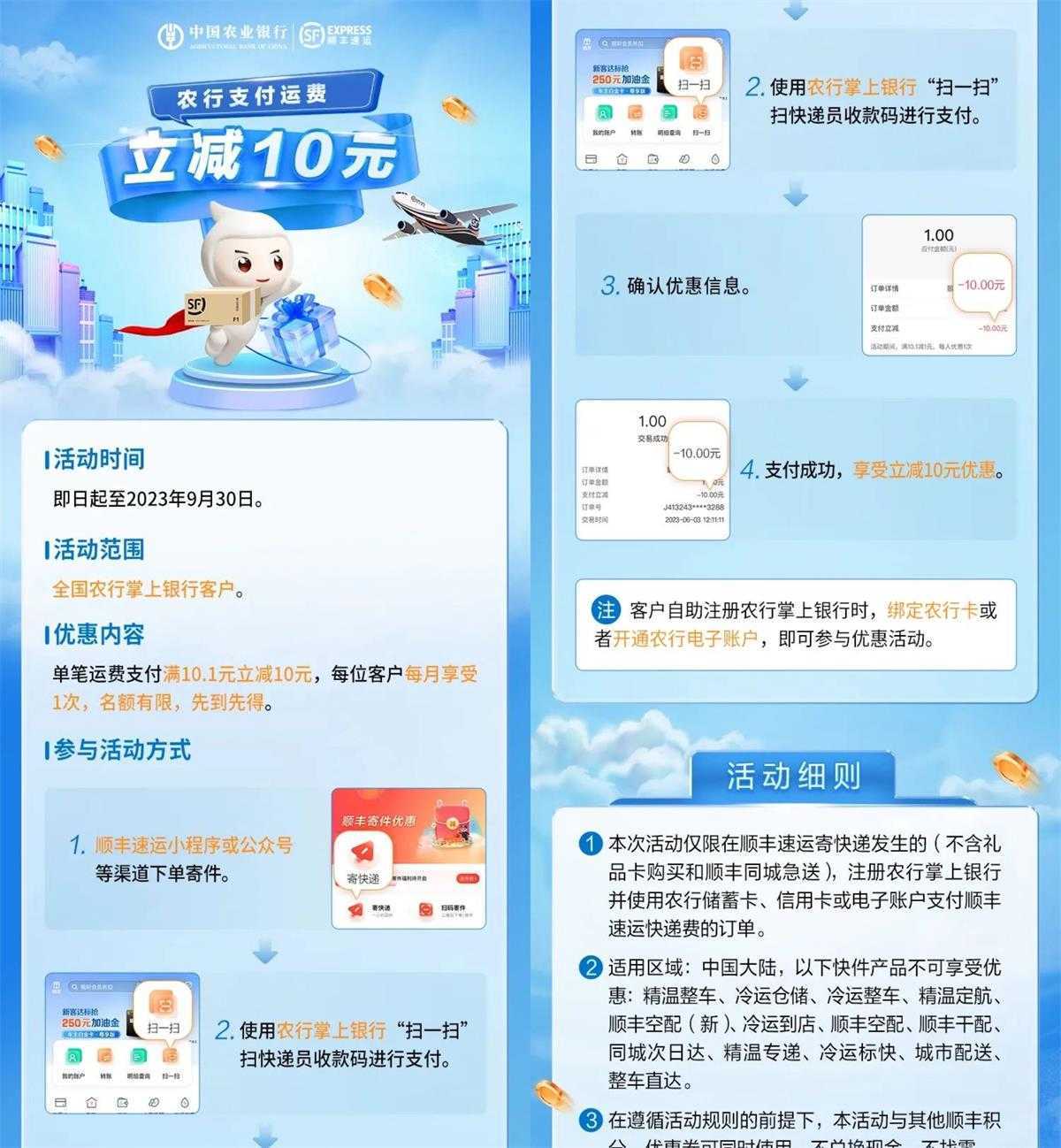 每个月仅限1次顺丰APP或小程序下单->用农行扫快递员的那个码满10.1元立减10元,同省大概2~3元寄快递,刚好要寄快递的可以看看!