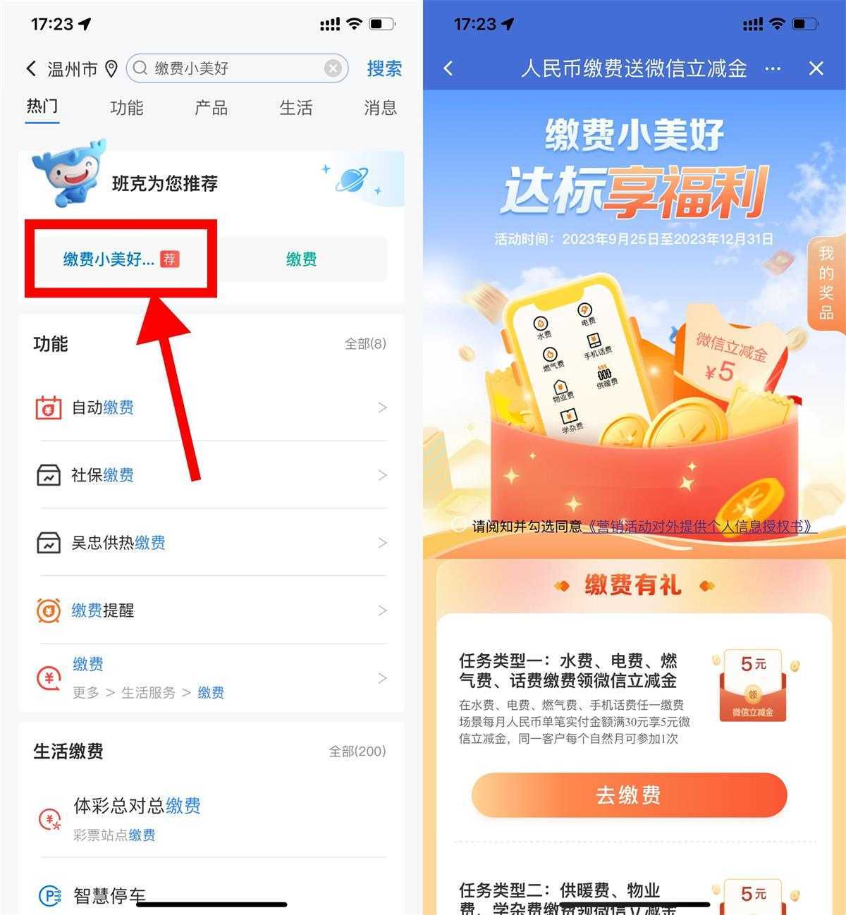 建行APP最新版->搜索“缴费小美好”->充30元水电燃气费或话费可领5元微信立减金,刚好要充的可以看看!